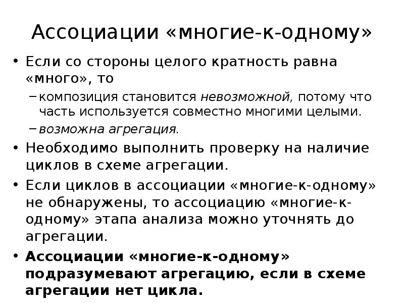 Ассоциации «многие-к-одному» Если со стороны целого кратность равна «много», то композиция становится невозможной, потому что часть используется совместно многими целыми. возможна агрегация. Необходимо выполнить проверку на наличие циклов в схеме агрегации. Если циклов в ассоциации «многие-к-одному» не обнаружены, то ассоциацию «многие-к-одному» этапа анализа можно уточнять до агрегации. Ассоциации «многие-к-одному» подразумевают агрегацию, если в схеме агрегации нет цикла.
