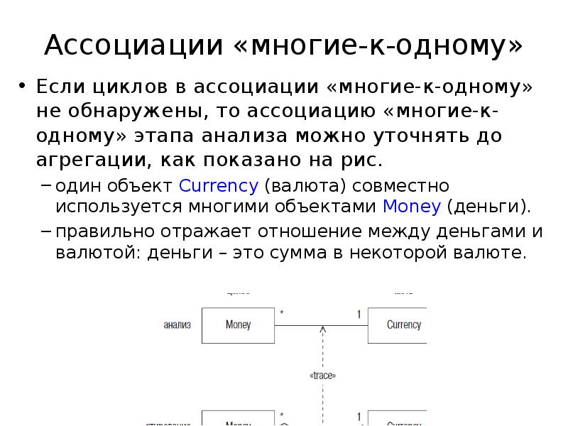 Ассоциации «многие-к-одному» Если циклов в ассоциации «многие-к-одному» не обнаружены, то ассоциацию «многие-к-одному» этапа анализа можно уточнять до агрегации, как показано на рис. один объект Currency (валюта) совместно используется многими объектами Money (деньги). правильно отражает отношение между деньгами и валютой: деньги – это сумма в некоторой валюте.