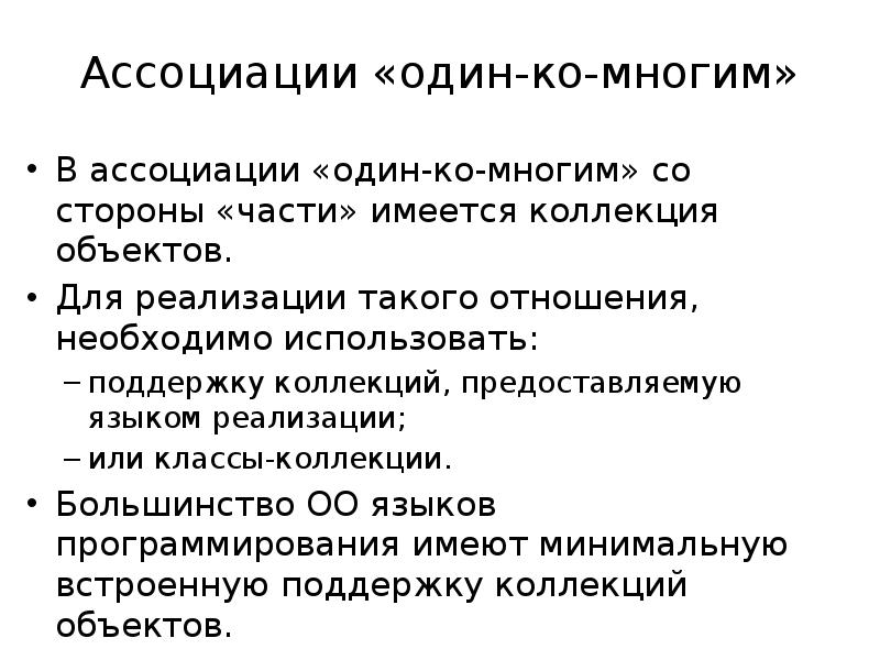 Ассоциации «один-ко-многим» В ассоциации «один-ко-многим» со стороны «части» имеется коллекция объектов. Для реализации такого отношения, необходимо использовать: поддержку коллекций, предоставляемую языком реализации; или классы-коллекции. Большинство ОО языков программирования имеют минимальную встроенную поддержку коллекций объектов.