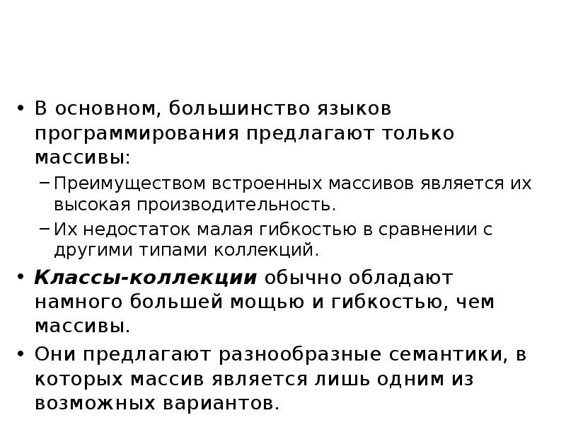 В основном, большинство языков программирования предлагают только массивы: Преимуществом встроенных массивов является их высокая производительность. Их недостаток малая гибкостью в сравнении с другими типами коллекций. Классы-коллекции обычно обладают намного большей мощью и гибкостью, чем массивы. Они предлагают разнообразные семантики, в которых массив является лишь одним из возможных вариантов.