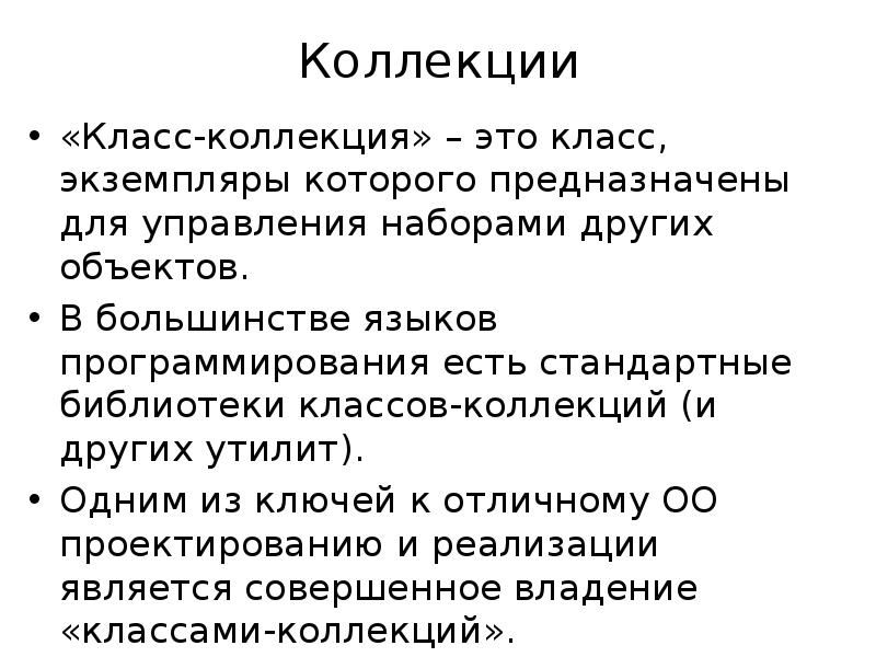 Коллекции «Класс-коллекция» – это класс, экземпляры которого предназначены для управления наборами других объектов. В большинстве языков программирования есть стандартные библиотеки классов-коллекций (и других утилит). Одним из ключей к отличному ОО проектированию и реализации является совершенное владение «классами-коллекций».