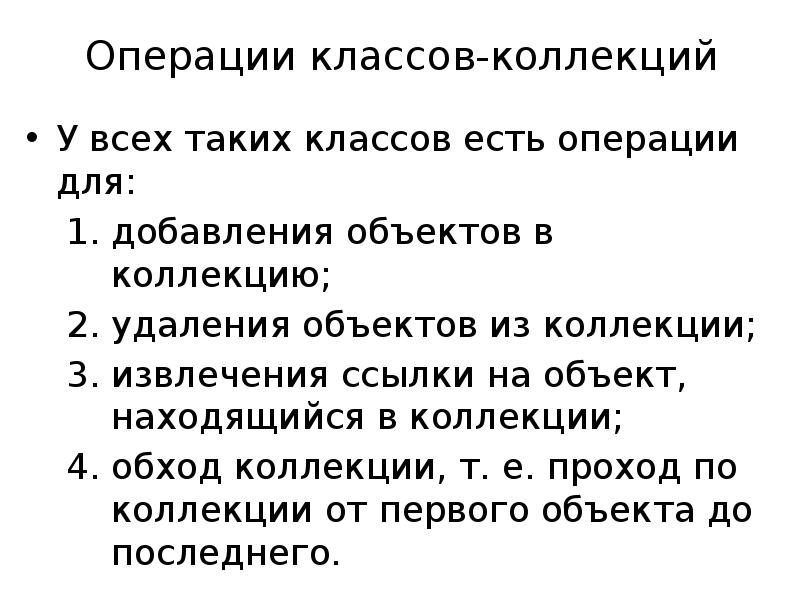 Операции классов-коллекций У всех таких классов есть операции для: добавления объектов в коллекцию; удаления объектов из коллекции; извлечения ссылки на объект, находящийся в коллекции; обход коллекции, т. е. проход по коллекции от первого объекта до последнего.
