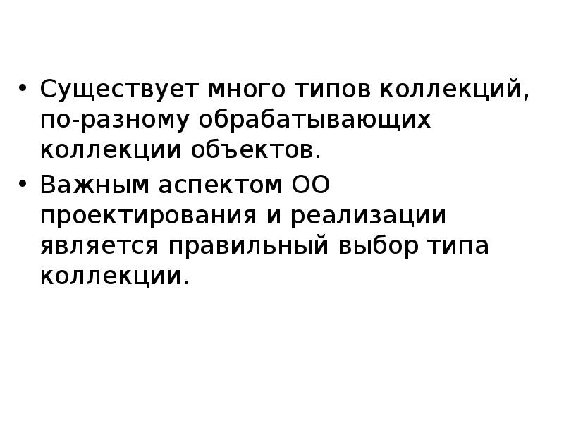 Существует много типов коллекций, по-разному обрабатывающих коллекции объектов. Важным аспектом ОО проектирования и реализации является правильный выбор типа коллекции.