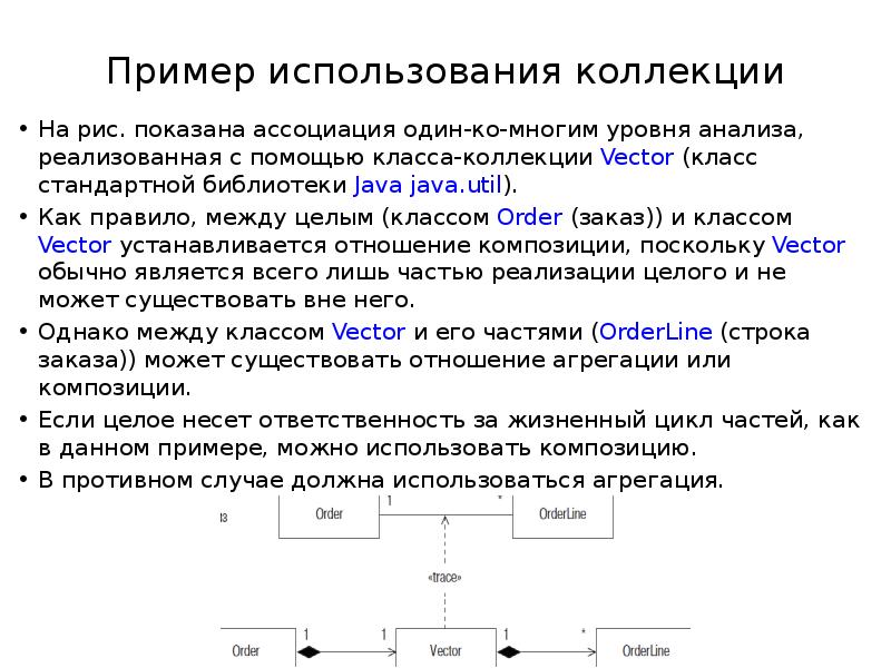 Пример использования коллекции На рис. показана ассоциация один-ко-многим уровня анализа, реализованная с помощью класса-коллекции Vector (класс стандартной библиотеки Java java.util). Как правило, между целым (классом Order (заказ)) и классом Vector устанавливается отношение композиции, поскольку Vector обычно является всего лишь частью реализации целого и не может существовать вне него. Однако между классом Vector и его частями (OrderLine (строка заказа)) может существовать отношение агрегации или композиции. Если целое несет ответственность за жизненный цикл частей, как в данном примере, можно использовать композицию. В противном случае должна использоваться агрегация.