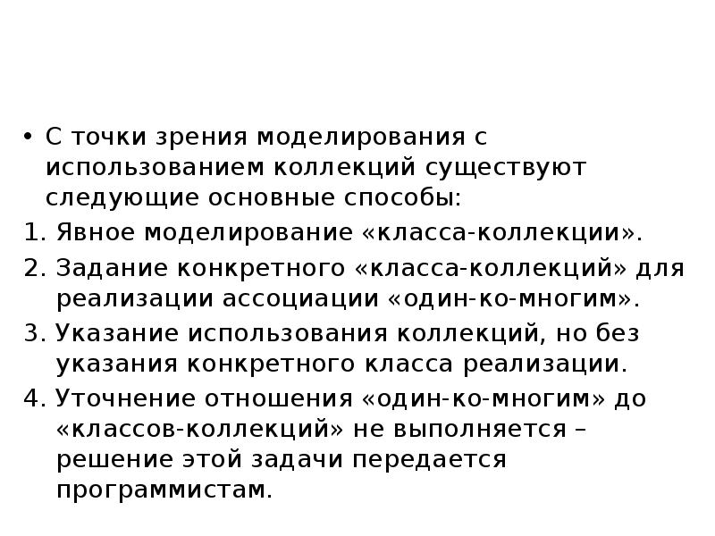 С точки зрения моделирования с использованием коллекций существуют следующие основные способы: Явное моделирование «класса-коллекции». Задание конкретного «класса-коллекций» для реализации ассоциации «один-ко-многим». Указание использования коллекций, но без указания конкретного класса реализации. Уточнение отношения «один-ко-многим» до «классов-коллекций» не выполняется – решение этой задачи передается программистам.