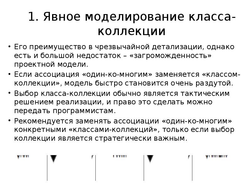 1. Явное моделирование класса-коллекции Его преимущество в чрезвычайной детализации, однако есть и большой недостаток – «загроможденность» проектной модели. Если ассоциация «один-ко-многим» заменяется «классом-коллекции», модель быстро становится очень раздутой. Выбор класса-коллекции обычно является тактическим решением реализации, и право это сделать можно передать программистам. Рекомендуется заменять ассоциации «один-ко-многим» конкретными «классами-коллекций», только если выбор коллекции является стратегически важным.