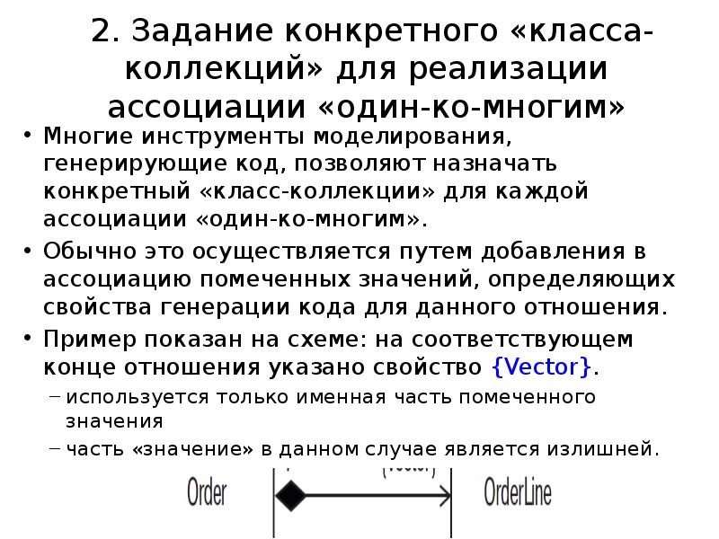 2. Задание конкретного «класса-коллекций» для реализации ассоциации «один-ко-многим» Многие инструменты моделирования, генерирующие код, позволяют назначать конкретный «класс-коллекции» для каждой ассоциации «один-ко-многим». Обычно это осуществляется путем добавления в ассоциацию помеченных значений, определяющих свойства генерации кода для данного отношения. Пример показан на схеме: на соответствующем конце отношения указано свойство {Vector}. используется только именная часть помеченного значения часть «значение» в данном случае является излишней.