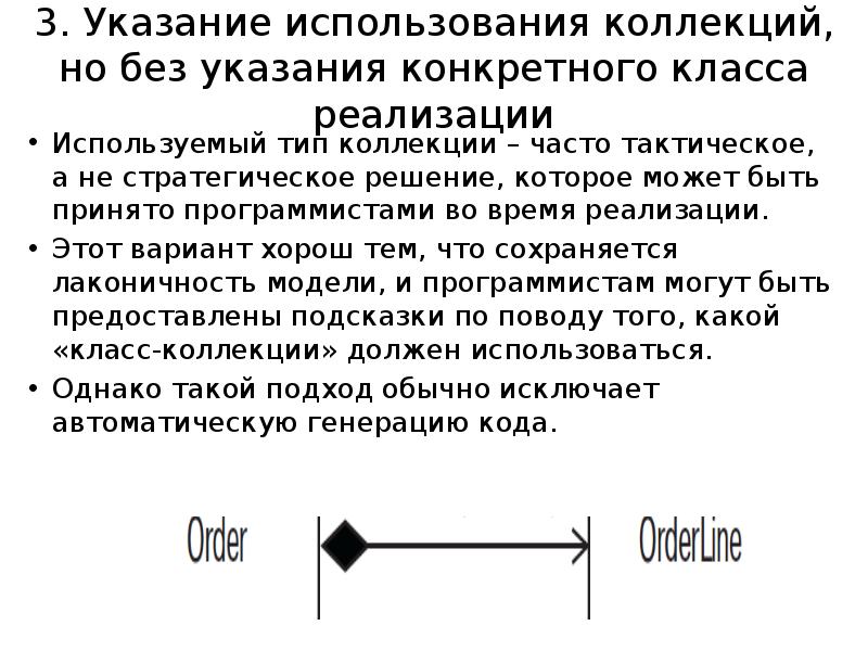 3. Указание использования коллекций, но без указания конкретного класса реализации Используемый тип коллекции – часто тактическое, а не стратегическое решение, которое может быть принято программистами во время реализации. Этот вариант хорош тем, что сохраняется лаконичность модели, и программистам могут быть предоставлены подсказки по поводу того, какой «класс-коллекции» должен использоваться. Однако такой подход обычно исключает автоматическую генерацию кода.