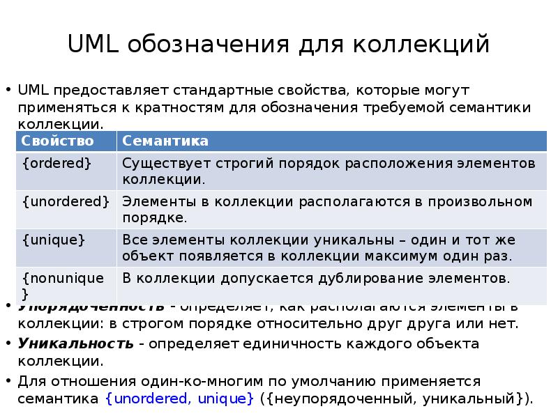 UML обозначения для коллекций UML предоставляет стандартные свойства, которые могут применяться к кратностям для обозначения требуемой семантики коллекции. Упорядоченность - определяет, как располагаются элементы в коллекции: в строгом порядке относительно друг друга или нет. Уникальность - определяет единичность каждого объекта коллекции. Для отношения один-ко-многим по умолчанию применяется семантика {unordered, unique} ({неупорядоченный, уникальный}).