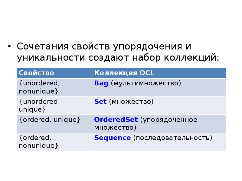 UML предоставляет стандартные свойства, которые могут применятьсяСочетания свойств упорядочения и уникальности создают набор коллекций:Конкретизация отношений