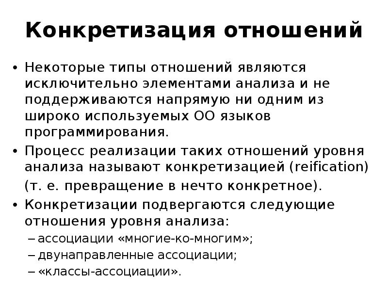 Конкретизация отношений Некоторые типы отношений являются исключительно элементами анализа и не поддерживаются напрямую ни одним из широко используемых ОО языков программирования. Процесс реализации таких отношений уровня анализа называют конкретизацией (reification) (т. е. превращение в нечто конкретное). Конкретизации подвергаются следующие отношения уровня анализа: ассоциации «многие-ко-многим»; двунаправленные ассоциации; «классы-ассоциации».