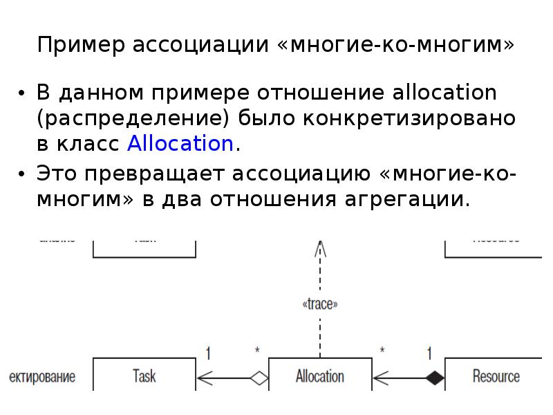 Пример ассоциации «многие-ко-многим» В данном примере отношение allocation (распределение) было конкретизировано в класс Allocation. Это превращает ассоциацию «многие-ко-многим» в два отношения агрегации.