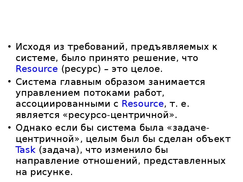 Исходя из требований, предъявляемых к системе, было принято решение, что Resource (ресурс) – это целое. Система главным образом занимается управлением потоками работ, ассоциированными с Resource, т. е. является «ресурсо-центричной». Однако если бы система была «задаче-центричной», целым был бы сделан объект Task (задача), что изменило бы направление отношений, представленных на рисунке.