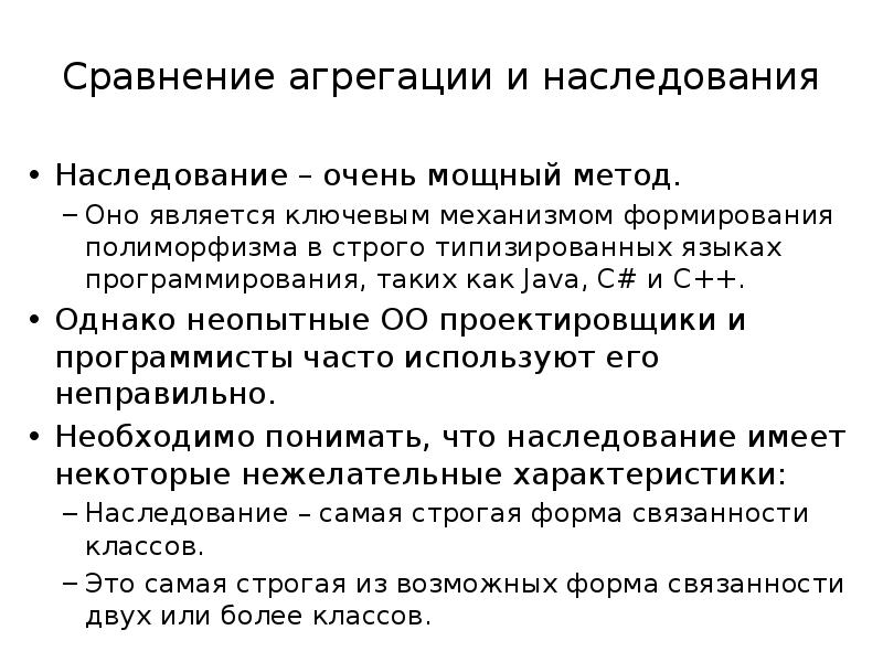 Сравнение агрегации и наследования Наследование – очень мощный метод. Оно является ключевым механизмом формирования полиморфизма в строго типизированных языках программирования, таких как Java, C# и C++. Однако неопытные ОО проектировщики и программисты часто используют его неправильно. Необходимо понимать, что наследование имеет некоторые нежелательные характеристики: Наследование – самая строгая форма связанности классов. Это самая строгая из возможных форма связанности двух или более классов.