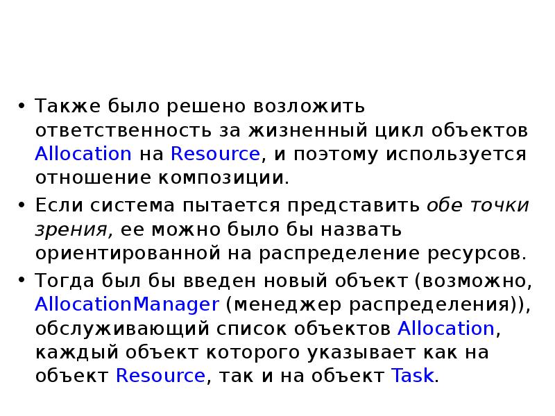 Также было решено возложить ответственность за жизненный цикл объектов Allocation на Resource, и поэтому используется отношение композиции. Если система пытается представить обе точки зрения, ее можно было бы назвать ориентированной на распределение ресурсов. Тогда был бы введен новый объект (возможно, AllocationManager (менеджер распределения)), обслуживающий список объектов Allocation, каждый объект которого указывает как на объект Resource, так и на объект Task.