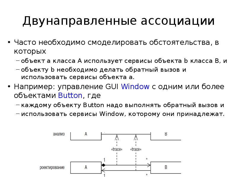 Двунаправленные ассоциации Часто необходимо смоделировать обстоятельства, в которых объект а класса А использует сервисы объекта b класса В, и объекту b необходимо делать обратный вызов и использовать сервисы объекта а. Например: управление GUI Window с одним или более объектами Button, где каждому объекту Button надо выполнять обратный вызов и использовать сервисы Window, которому они принадлежат.
