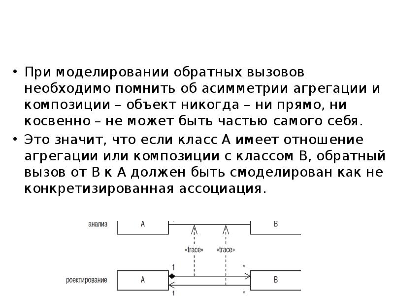 При моделировании обратных вызовов необходимо помнить об асимметрии агрегации и композиции – объект никогда – ни прямо, ни косвенно – не может быть частью самого себя. Это значит, что если класс А имеет отношение агрегации или композиции с классом В, обратный вызов от В к А должен быть смоделирован как не конкретизированная ассоциация.