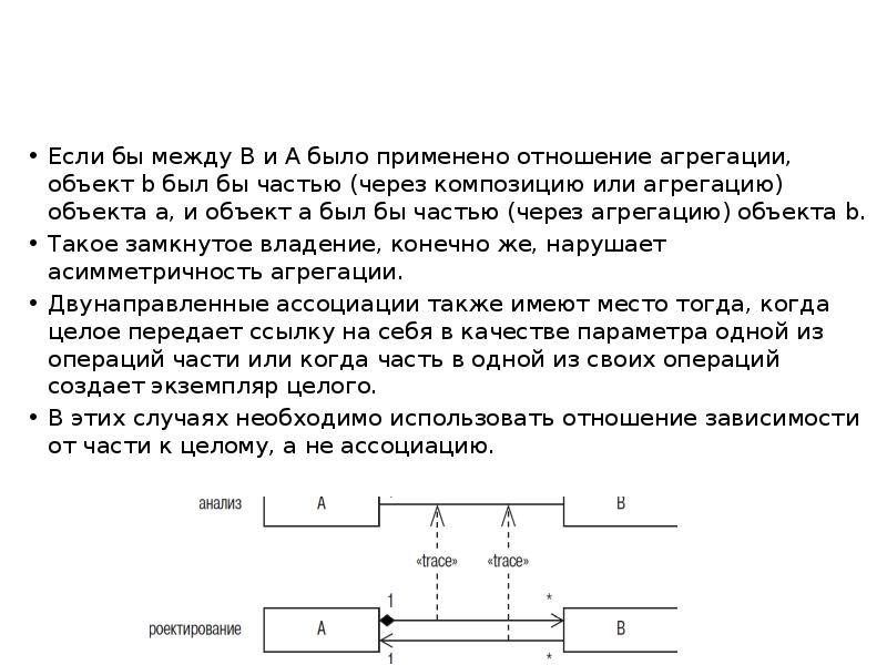 Если бы между B и A было применено отношение агрегации, объект b был бы частью (через композицию или агрегацию) объекта а, и объект а был бы частью (через агрегацию) объекта b. Такое замкнутое владение, конечно же, нарушает асимметричность агрегации. Двунаправленные ассоциации также имеют место тогда, когда целое передает ссылку на себя в качестве параметра одной из операций части или когда часть в одной из своих операций создает экземпляр целого. В этих случаях необходимо использовать отношение зависимости от части к целому, а не ассоциацию.
