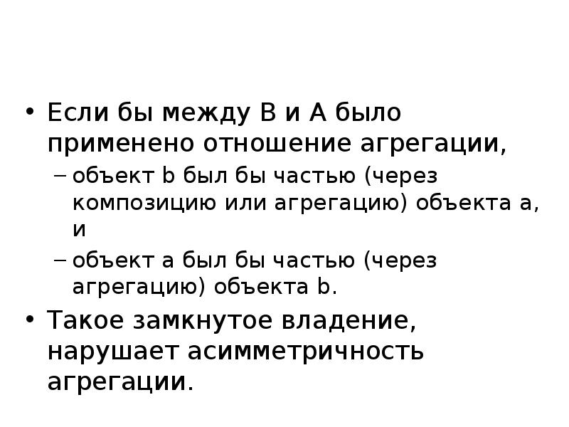 Если бы между B и A было применено отношение агрегации, объект b был бы частью (через композицию или агрегацию) объекта а, и объект а был бы частью (через агрегацию) объекта b. Такое замкнутое владение, нарушает асимметричность агрегации.