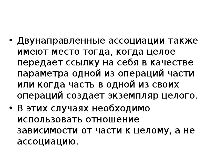 Двунаправленные ассоциации также имеют место тогда, когда целое передает ссылку на себя в качестве параметра одной из операций части или когда часть в одной из своих операций создает экземпляр целого. В этих случаях необходимо использовать отношение зависимости от части к целому, а не ассоциацию.