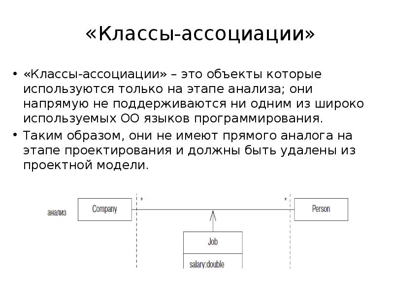 «Классы-ассоциации» «Классы-ассоциации» – это объекты которые используются только на этапе анализа; они напрямую не поддерживаются ни одним из широко используемых ОО языков программирования. Таким образом, они не имеют прямого аналога на этапе проектирования и должны быть удалены из проектной модели.