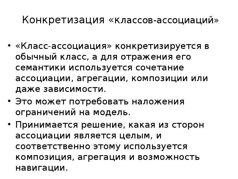 Конкретизация «классов-ассоциаций» «Класс-ассоциация» конкретизируется в обычный класс, а для отражения его семантики используется сочетание ассоциации, агрегации, композиции или даже зависимости. Это может потребовать наложения ограничений на модель. Принимается решение, какая из сторон ассоциации является целым, и соответственно этому используется композиция, агрегация и возможность навигации.