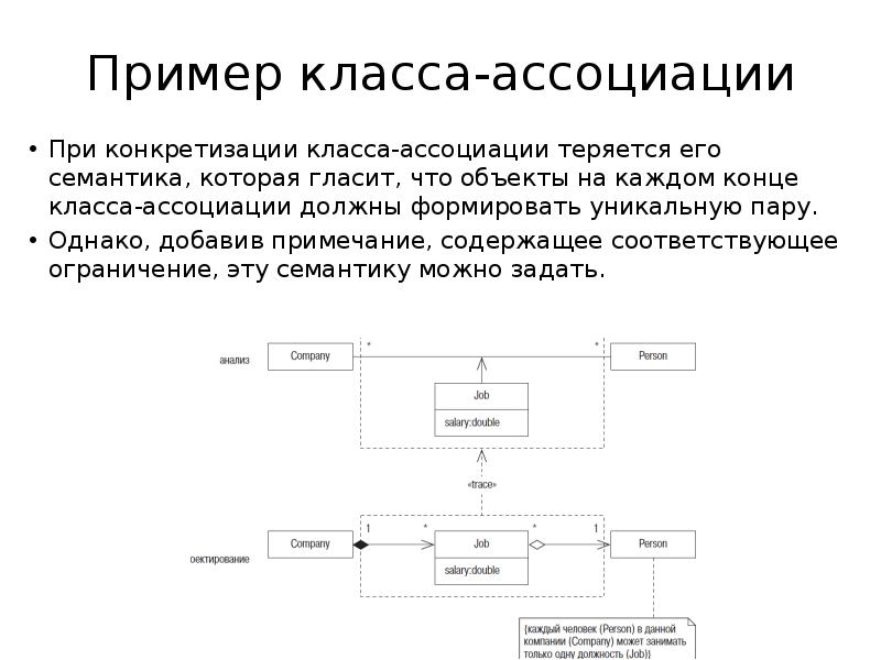 Пример класса-ассоциации При конкретизации класса-ассоциации теряется его семантика, которая гласит, что объекты на каждом конце класса-ассоциации должны формировать уникальную пару. Однако, добавив примечание, содержащее соответствующее ограничение, эту семантику можно задать.