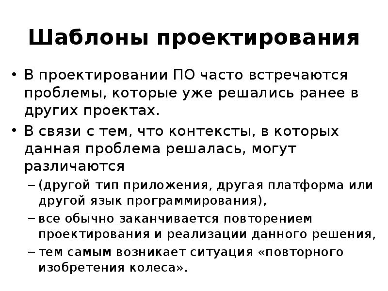Шаблоны проектирования В проектировании ПО часто встречаются проблемы, которые уже решались ранее в других проектах. В связи с тем, что контексты, в которых данная проблема решалась, могут различаются (другой тип приложения, другая платформа или другой язык программирования), все обычно заканчивается повторением проектирования и реализации данного решения, тем самым возникает ситуация «повторного изобретения колеса».