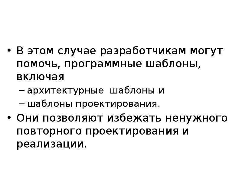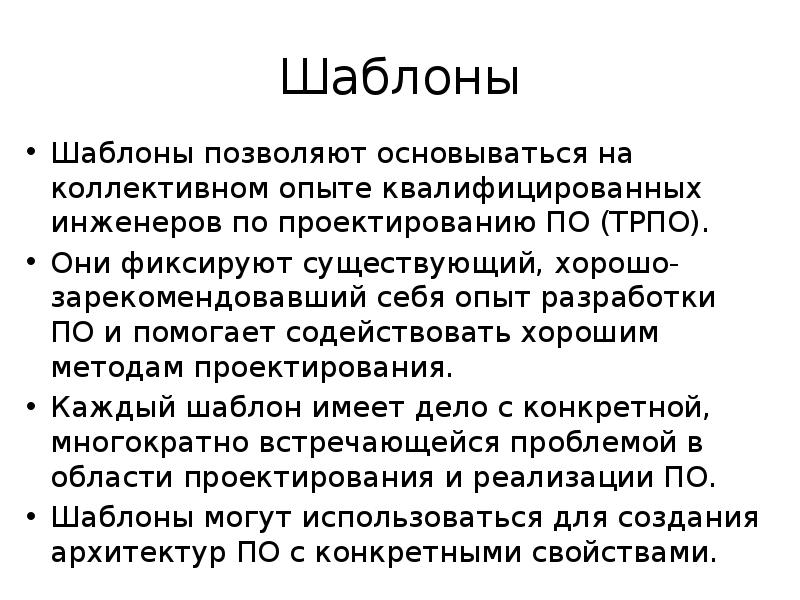 Шаблоны Шаблоны позволяют основываться на коллективном опыте квалифицированных инженеров по проектированию ПО (ТРПО). Они фиксируют существующий, хорошо-зарекомендовавший себя опыт разработки ПО и помогает содействовать хорошим методам проектирования. Каждый шаблон имеет дело с конкретной, многократно встречающейся проблемой в области проектирования и реализации ПО. Шаблоны могут использоваться для создания архитектур ПО с конкретными свойствами.