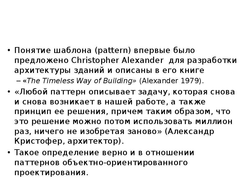 Понятие шаблона (pattern) впервые было предложено Christopher Alexander для разработки архитектуры зданий и описаны в его книге «The Timeless Way of Building» (Alexander 1979). «Любой паттерн описывает задачу, которая снова и снова возникает в нашей работе, а также принцип ее решения, причем таким образом, что это решение можно потом использовать миллион раз, ничего не изобретая заново» (Александр Кристофер, архитектор). Такое определение верно и в отношении паттернов объектно-ориентированного проектирования.