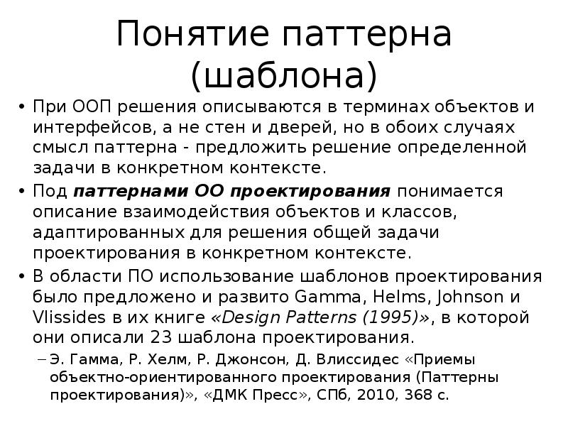 Понятие паттерна (шаблона) При ООП решения описываются в терминах объектов и интерфейсов, а не стен и дверей, но в обоих случаях смысл паттерна - предложить решение определенной задачи в конкретном контексте. Под паттернами ОО проектирования понимается описание взаимодействия объектов и классов, адаптированных для решения общей задачи проектирования в конкретном контексте. В области ПО использование шаблонов проектирования было предложено и развито Gamma, Helms, Johnson и Vlissides в их книге «Design Patterns (1995)», в которой они описали 23 шаблона проектирования. Э. Гамма, Р. Хелм, Р. Джонсон, Д. Влиссидес «Приемы объектно-ориентированного проектирования (Паттерны проектирования)», «ДМК Пресс», СПб, 2010, 368 с.