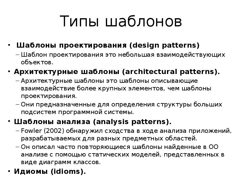 Типы шаблонов Шаблоны проектирования (design patterns) Шаблон проектирования это небольшая взаимодействующих объектов. Архитектурные шаблоны (architectural patterns). Архитектурные шаблоны это шаблоны описывающие взаимодействие более крупных элементов, чем шаблоны проектирования. Они предназначенные для определения структуры больших подсистем программной системы. Шаблоны анализа (analysis patterns). Fowler (2002) обнаружил сходства в ходе анализа приложений, разрабатываемых для разных предметных областей. Он описал часто повторяющиеся шаблоны найденные в ОО анализе с помощью статических моделей, представленных в виде диаграмм классов. Идиомы (idioms).