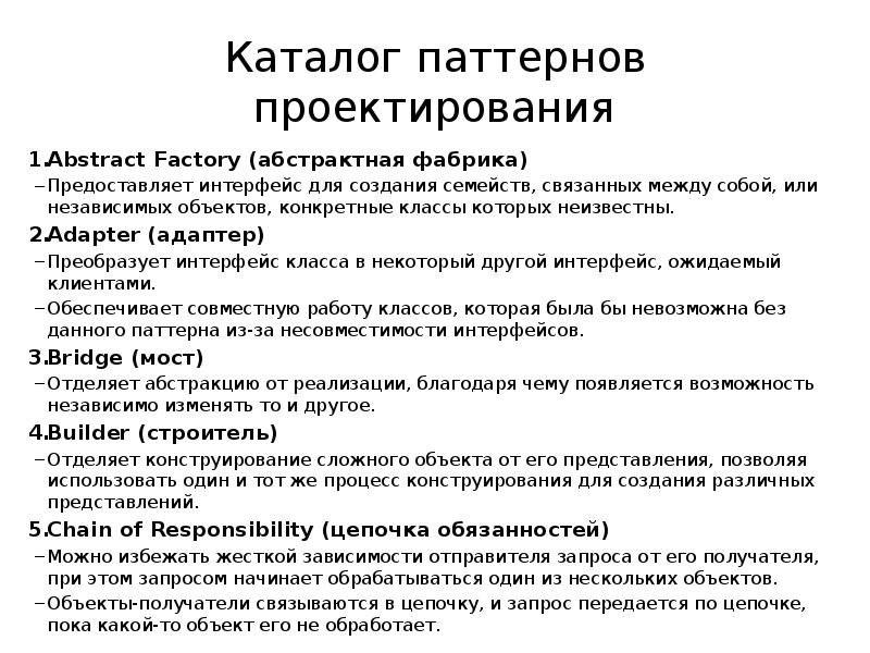 Каталог паттернов проектирования Abstract Factory (абстрактная фабрика) Предоставляет интерфейс для создания семейств, связанных между собой, или независимых объектов, конкретные классы которых неизвестны. Adapter (адаптер) Преобразует интерфейс класса в некоторый другой интерфейс, ожидаемый клиентами. Обеспечивает совместную работу классов, которая была бы невозможна без данного паттерна из-за несовместимости интерфейсов. Bridge (мост) Отделяет абстракцию от реализации, благодаря чему появляется возможность независимо изменять то и другое. Builder (строитель) Отделяет конструирование сложного объекта от его представления, позволяя использовать один и тот же процесс конструирования для создания различных представлений. Chain of Responsibility (цепочка обязанностей) Можно избежать жесткой зависимости отправителя запроса от его получателя, при этом запросом начинает обрабатываться один из нескольких объектов. Объекты-получатели связываются в цепочку, и запрос передается по цепочке, пока какой-то объект его не обработает.