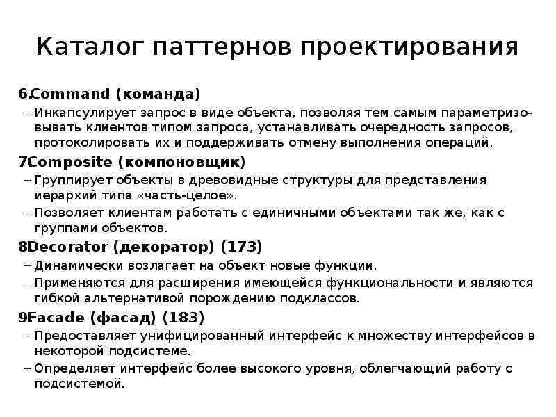 Каталог паттернов проектирования Command (команда) Инкапсулирует запрос в виде объекта, позволяя тем самым параметризо-вывать клиентов типом запроса, устанавливать очередность запросов, протоколировать их и поддерживать отмену выполнения операций. Composite (компоновщик) Группирует объекты в древовидные структуры для представления иерархий типа «часть-целое». Позволяет клиентам работать с единичными объектами так же, как с группами объектов. Decorator (декоратор) (173) Динамически возлагает на объект новые функции. Применяются для расширения имеющейся функциональности и являются гибкой альтернативой порождению подклассов. Facade (фасад) (183) Предоставляет унифицированный интерфейс к множеству интерфейсов в некоторой подсистеме. Определяет интерфейс более высокого уровня, облегчающий работу с подсистемой.