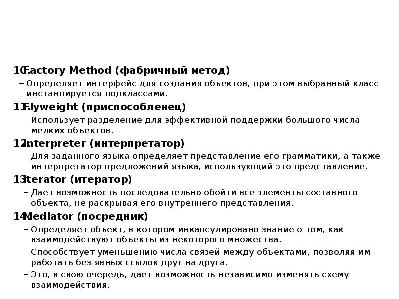 Factory Method (фабричный метод) Определяет интерфейс для создания объектов, при этом выбранный класс инстанцируется подклассами. Flyweight (приспособленец) Использует разделение для эффективной поддержки большого числа мелких объектов. Interpreter (интерпретатор) Для заданного языка определяет представление его грамматики, а также интерпретатор предложений языка, использующий это представление. Iterator (итератор) Дает возможность последовательно обойти все элементы составного объекта, не раскрывая его внутреннего представления. Mediator (посредник) Определяет объект, в котором инкапсулировано знание о том, как взаимодействуют объекты из некоторого множества. Способствует уменьшению числа связей между объектами, позволяя им работать без явных ссылок друг на друга. Это, в свою очередь, дает возможность независимо изменять схему взаимодействия.
