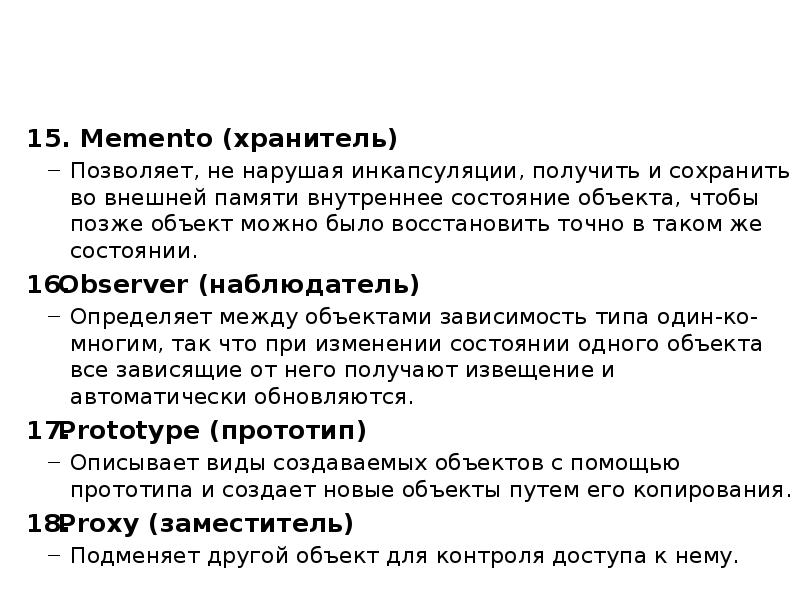 15. Memento (хранитель) Позволяет, не нарушая инкапсуляции, получить и сохранить во внешней памяти внутреннее состояние объекта, чтобы позже объект можно было восстановить точно в таком же состоянии. Observer (наблюдатель) Определяет между объектами зависимость типа один-ко-многим, так что при изменении состоянии одного объекта все зависящие от него получают извещение и автоматически обновляются. Prototype (прототип) Описывает виды создаваемых объектов с помощью прототипа и создает новые объекты путем его копирования. Proxy (заместитель) Подменяет другой объект для контроля доступа к нему.