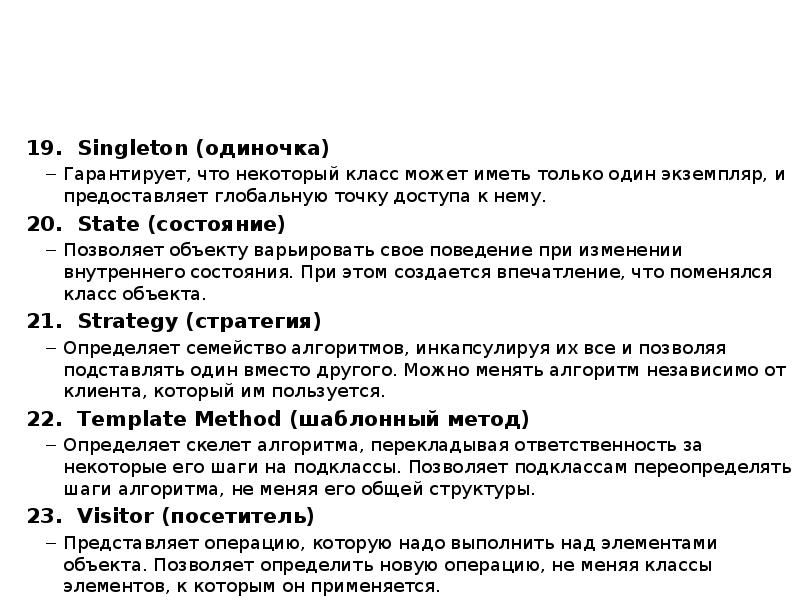 19. Singleton (одиночка) Гарантирует, что некоторый класс может иметь только один экземпляр, и предоставляет глобальную точку доступа к нему. 20. State (состояние) Позволяет объекту варьировать свое поведение при изменении внутреннего состояния. При этом создается впечатление, что поменялся класс объекта. 21. Strategy (стратегия) Определяет семейство алгоритмов, инкапсулируя их все и позволяя подставлять один вместо другого. Можно менять алгоритм независимо от клиента, который им пользуется. 22. Template Method (шаблонный метод) Определяет скелет алгоритма, перекладывая ответственность за некоторые его шаги на подклассы. Позволяет подклассам переопределять шаги алгоритма, не меняя его общей структуры. 23. Visitor (посетитель) Представляет операцию, которую надо выполнить над элементами объекта. Позволяет определить новую операцию, не меняя классы элементов, к которым он применяется.