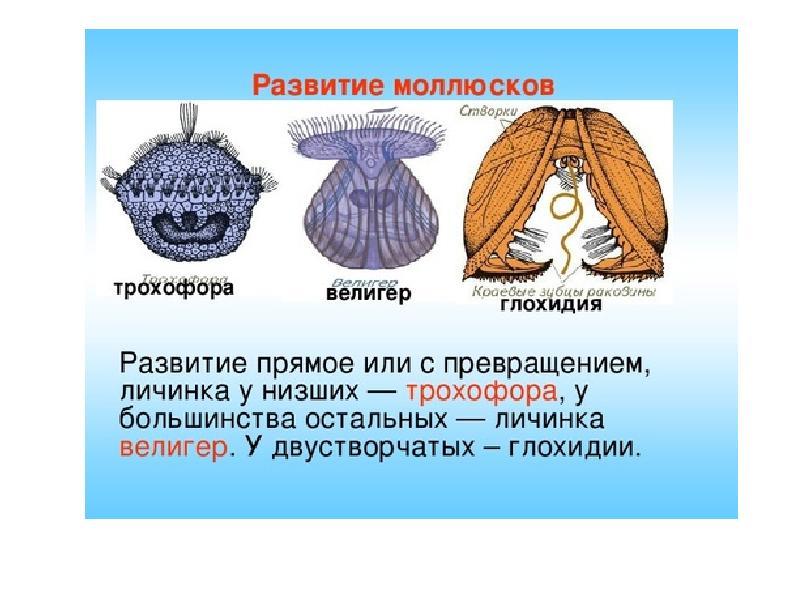 - 42. Развитие моллюсков В развитии много общего с кольчатыми червями: сходно дробление;