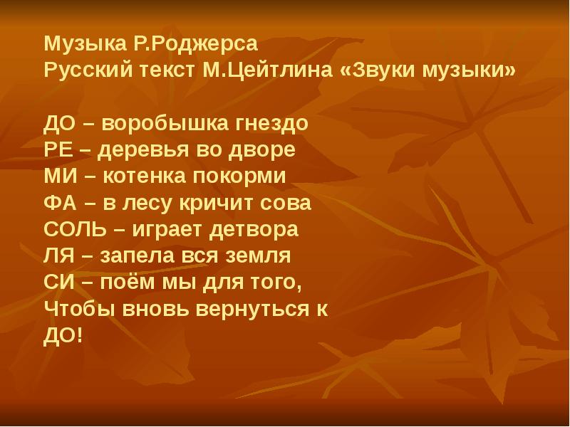 Музыка Р.Роджерса Русский текст М.Цейтлина «Звуки музыки» ДО – воробышка гнездо РЕ – деревья во дворе МИ – котенка покорми ФА – в презентация
