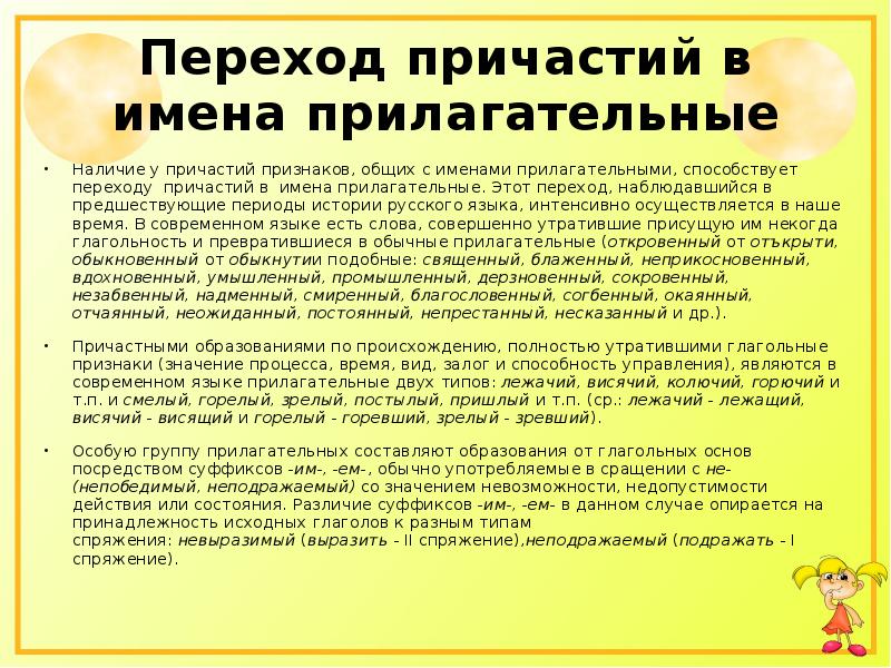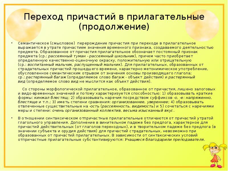 - 12. Переход причастий в прилагательные (продолжение) Семантическое (смысловое) перерождение причастия при переходе