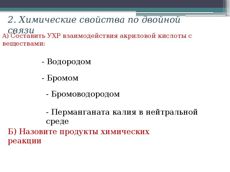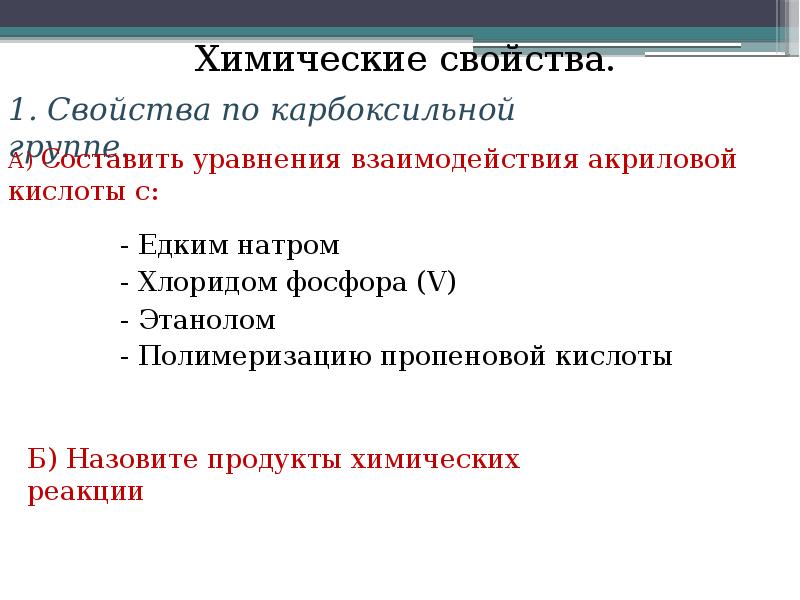 Химические свойства Реакционная способность ненасыщенных кк обусловлена наличием карбоксильной группы и кратной связи.