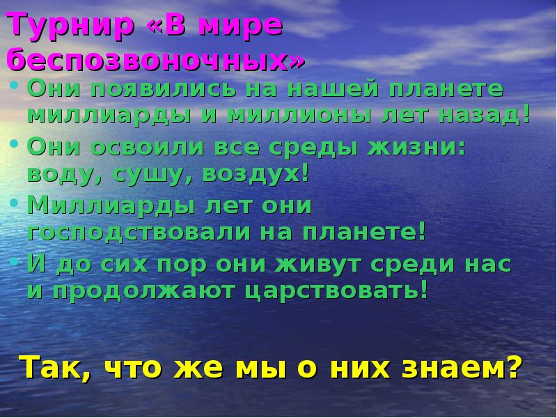 - 2. Турнир «В мире беспозвоночных» Они появились на нашей планете миллиарды и
