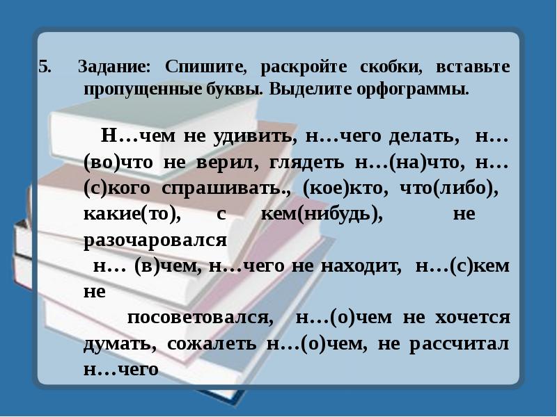 - 6. Списать, обозначить орфограммы: (Ни)(о)ком, (ни)кем, н(и,е)чего надеть, н(и, е) кем заменить,