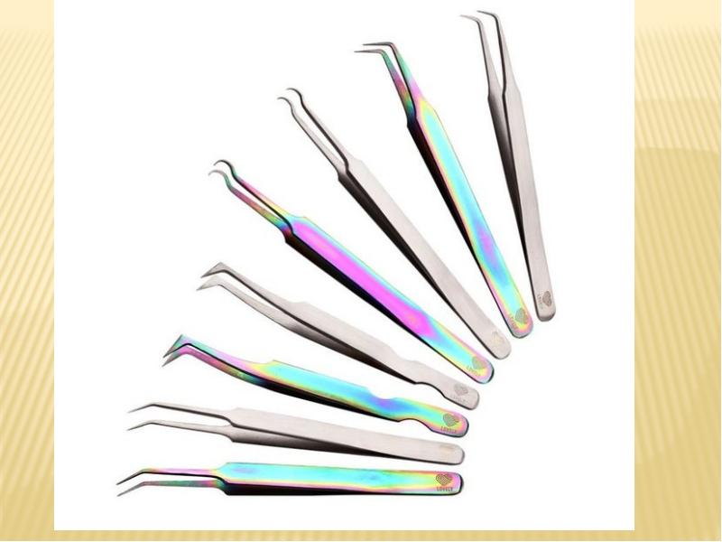 - 27. Необходимые материалы 1. Пинцеты – прямой и изогнутый 2. Подложки(скотч, патчи,