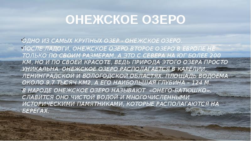 - 19. Планируя поездку в Карелию, обязательно посетите Онежское озеро Онежское озеро занимает