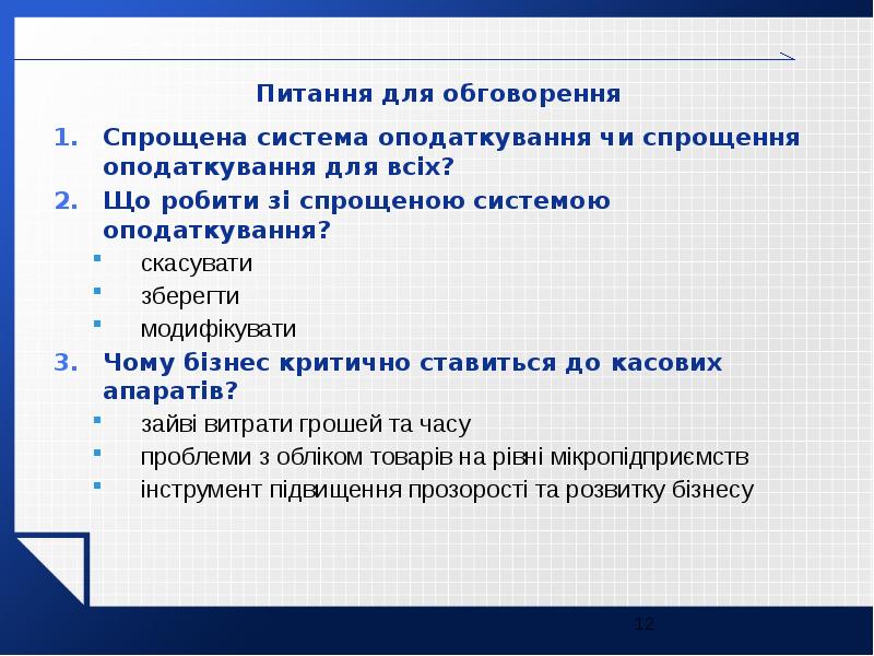 - 12. Питання для обговорення Питання для обговорення Спрощена система оподаткування чи спрощення