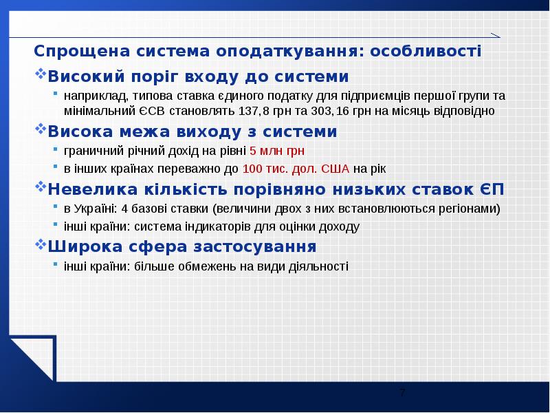 - 7. Спрощена система оподаткування: особливості Спрощена система оподаткування: особливості Високий поріг входу