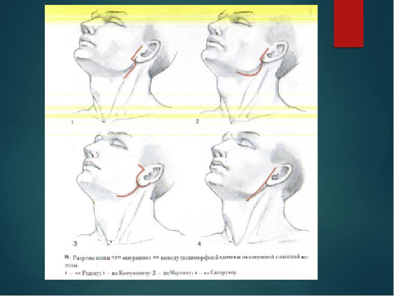 - 34. Типичными операциями при опухолях околоушной слюнной железыявляются резекция околоушной слюнной железы,