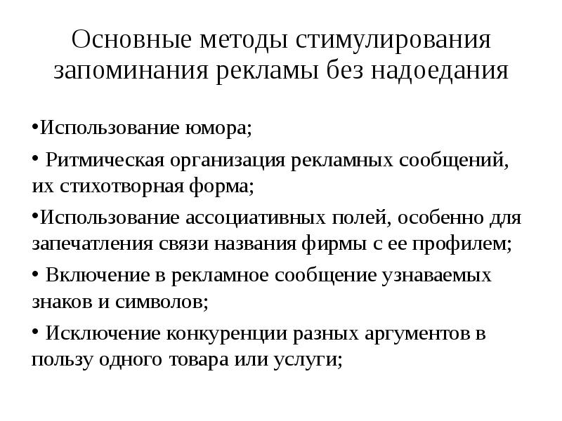 Основные методы стимулирования запоминания рекламы без надоедания презентация