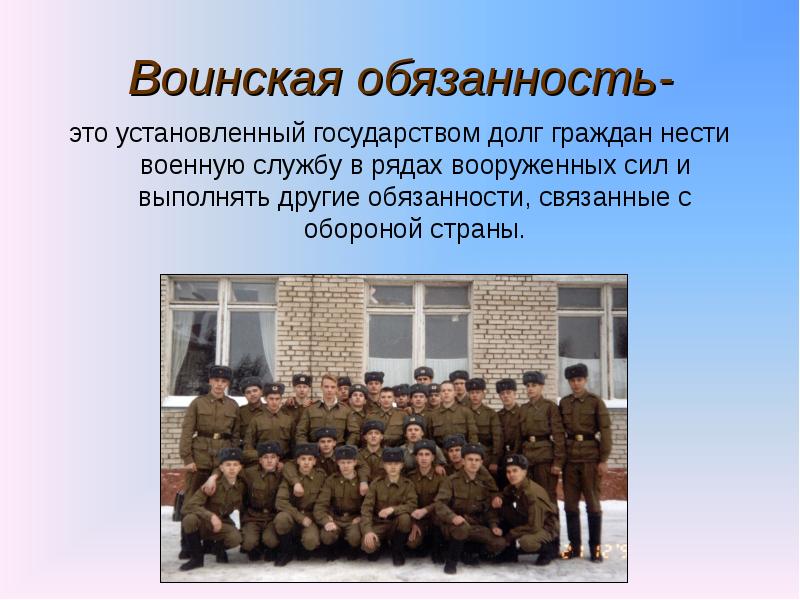 - 3. Воинская обязанность- это установленный государством долг граждан нести военную службу в